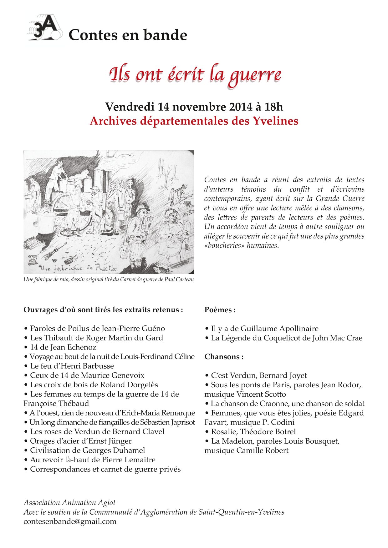 Le groupe "Contes en bande" de l’association d’animation de l’Agiot, 3A, composé de 8 lecteurs, deux chanteurs et une accordéoniste a réuni des extraits de textes d’auteurs témoins du conflit et d’écrivains contemporains ayant écrit surla Grande Guerre, et vous propose un spectacle sous la forme d'une lecture théâtralisée mêlant des chansons, des lettres, des poèmes et accompagnée d’un accordéon.