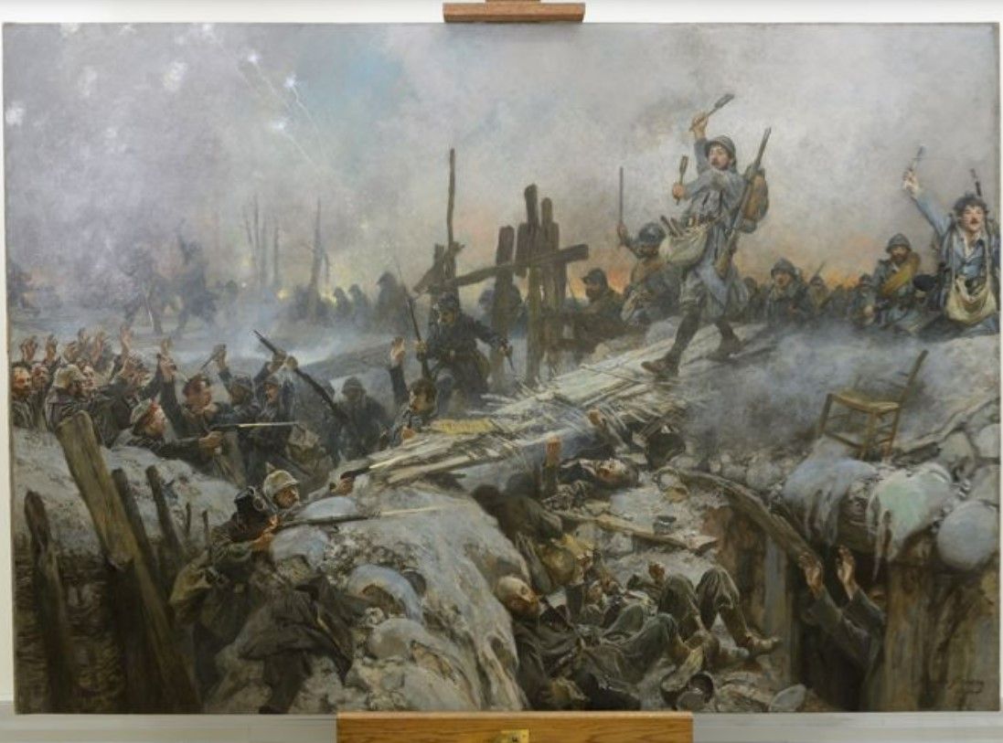 La restauration du tableau de Courgent : La Bataille du 25 septembre 1915 (Champagne), prise de la tranchée allemande devant Perthes (9 heures 30 du matin), peint par François Flameng (1856-1923).