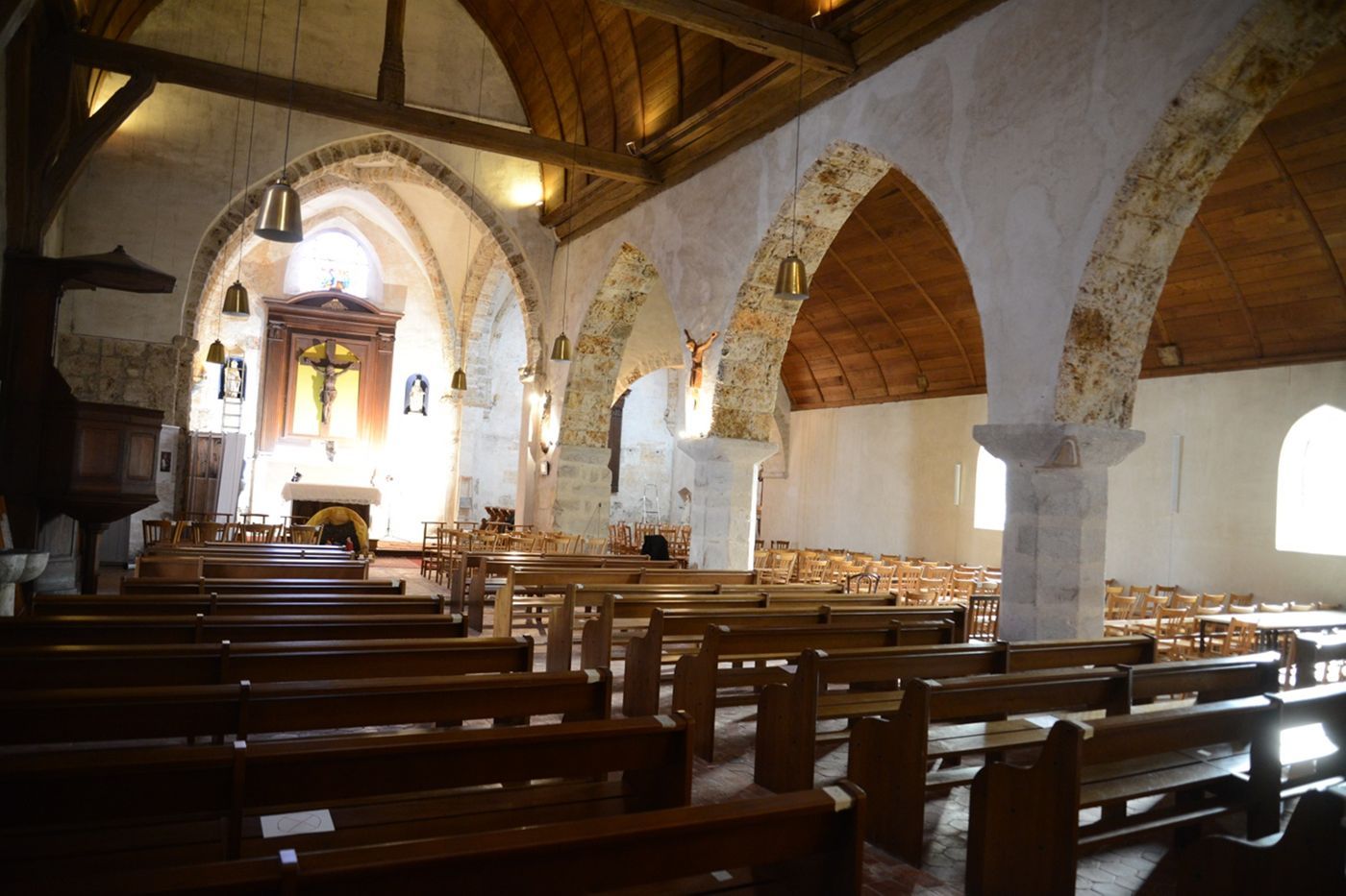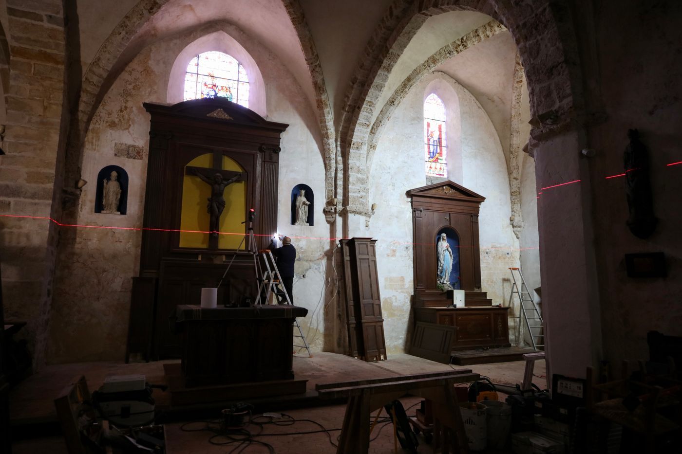 Après de premiers travaux engagés sur l’église de Cernay-la-Ville, la commune a souhaité restaurer, avec l’aide du Département des Yvelines, l’ensemble des boiseries conservées dans le chœur de l’édifice et dans les deux chapelles adjacentes. Ces éléments datés de la fin du XIXe siècle sont constitués de trois retables (retable de la Vierge, retable saint Joseph et retable majeur), de trois autels et de lambris. Ils souffraient de l’humidité et d’une importante attaque d’insectes qui les a fragilisés et a engendré d’importants désordres structurels (fentes des bois, désolidarisation des assemblages…). Les bois ont été traités et consolidés, les assemblages repris et renforcés, les ornements décoratifs complétés et les ajouts disgracieux et non originaux remplacés. Cette intervention avait pour objectif de redonner une homogénéité à l’ensemble des boiseries du chœur tout en conservant au maximum l’existant, qui fait aujourd’hui le charme de l’édifice.